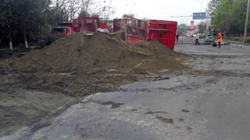 4月12日早上7:20,綿江路K282+100西科大門口,兩輛滿載砂石的運(yùn)輸貨車,在江油至綿陽方向行駛的過程中,因變道發(fā)生撞車事故。事故現(xiàn)場(chǎng)砂石嚴(yán)重傾覆路面,其中一輛運(yùn)輸貨車冒起白煙,情況十分嚴(yán)峻。