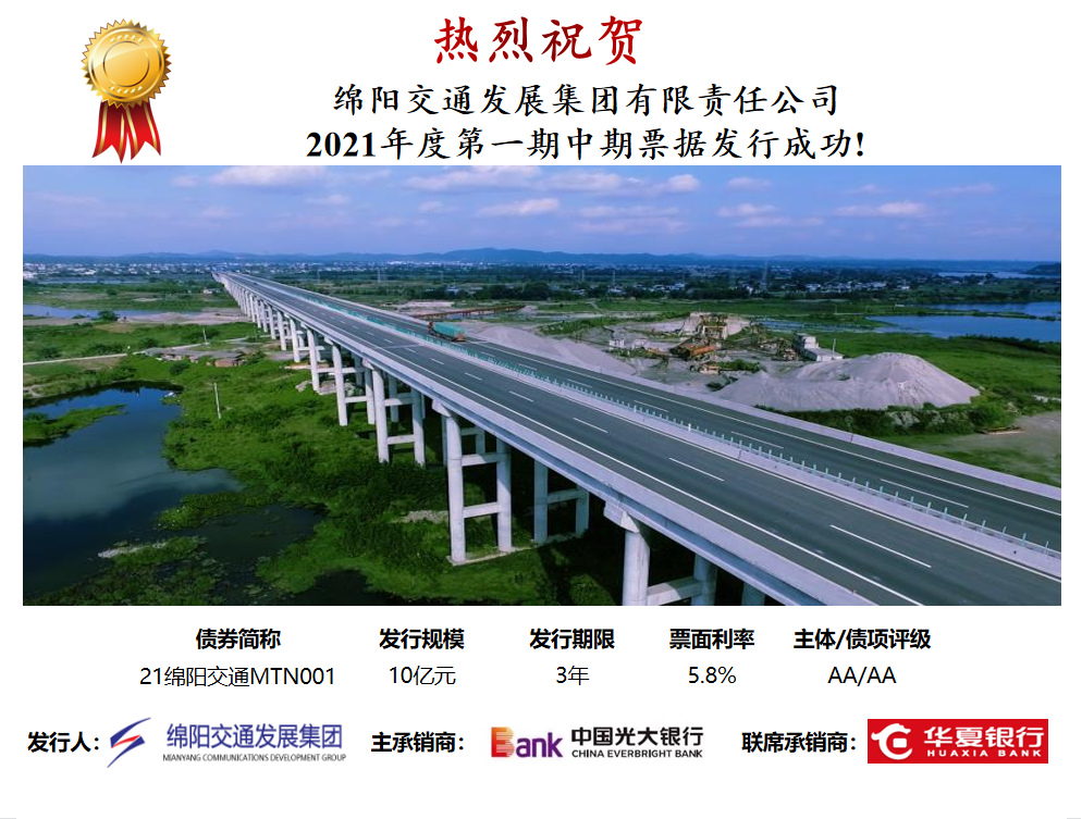 ? ? ? ?6月18日,“綿陽(yáng)交通發(fā)展集團(tuán)有限責(zé)任公司2021年度第一期中期票據(jù)”(簡(jiǎn)稱“21綿陽(yáng)交通MTN001”)在銀行間市場(chǎng)成功發(fā)行,債券代碼:102101130,發(fā)行規(guī)模10億元,產(chǎn)品期限3年,票面利率5.8%。為增加有效申購(gòu)金額,確保以較低成本發(fā)行本期中票,公司積極向金融機(jī)構(gòu)推介,加強(qiáng)對(duì)接,為本次中票順利發(fā)行奠定了堅(jiān)實(shí)基礎(chǔ)。